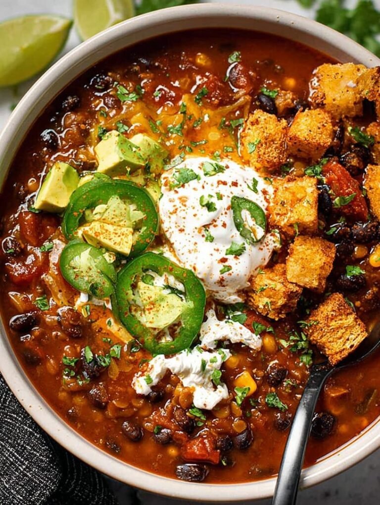- For a fresh and creamy finish, serve piping hot bowls topped with a dollop of vegan sour cream or a sprinkle of fresh cilantro and crushed tortilla chips for texture.