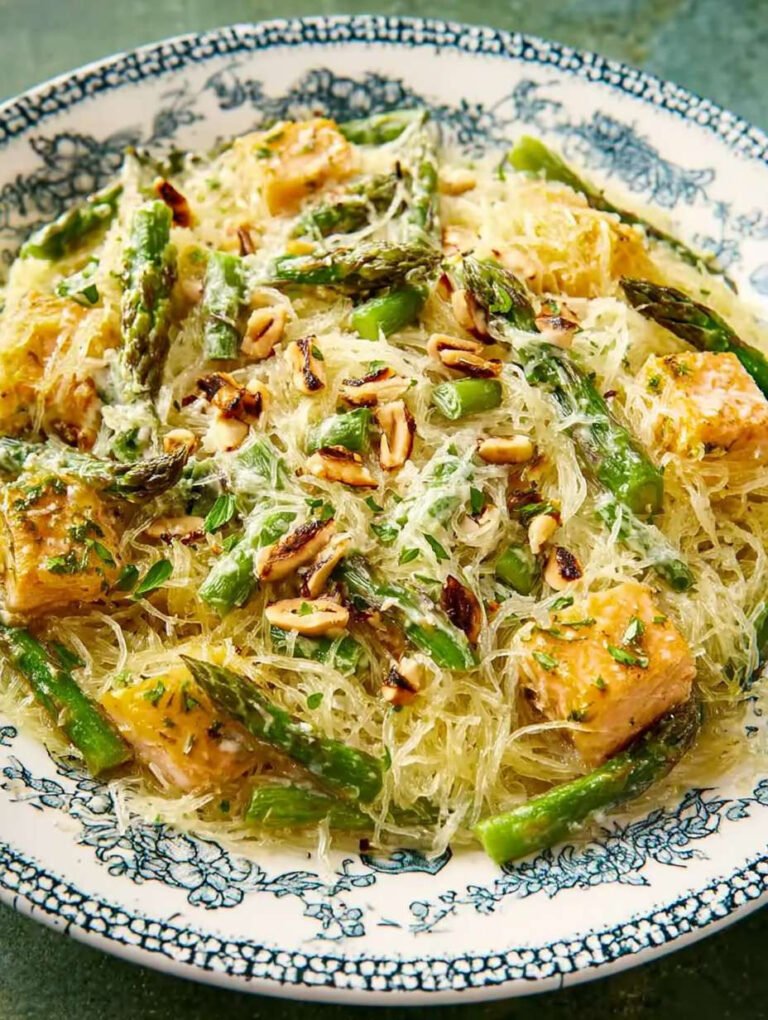 This delightful dish combines the earthy tones of asparagus with creamy ricotta, all nestled in strands of spaghetti squash for a wholesome meal.