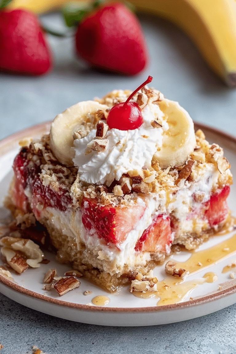 First, prep all your ingredients. Then, layer the cake ingredients in your baking dish. Bake until golden brown and bubbly. Let it cool slightly before serving. Enjoy your delicious Banana Split Dump Cake Recipe!