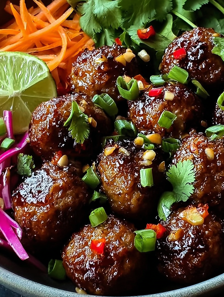 Swap the ground beef/chicken blend for ground turkey for a leaner option. Try adding finely chopped lemongrass to the meatballs for an authentic citrus note, or swap sriracha for a milder sweet chili sauce if you prefer less heat.