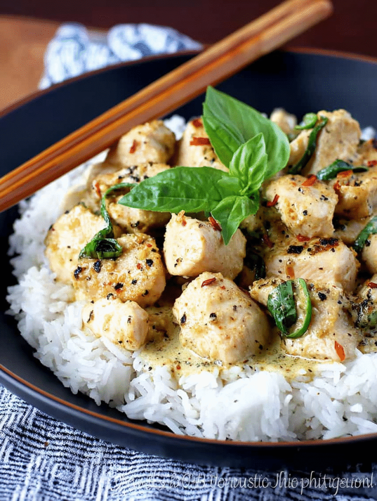 Skip takeout! Achieve explosive flavor with this quick Basil Chicken. Tender chicken seared, then simmered in rich coconut curry and fragrant Thai basil. Full instructions and nutrition facts inside.