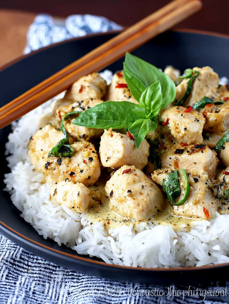 - Step 5: Remove the skillet from the heat. Stir in the packed Thai Basil leaves until they wilt slightly (about 1 minute), then serve the Basil Chicken with Coconut Curry Sauce immediately over steamed rice.