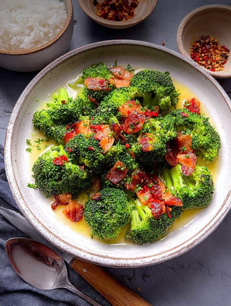 Follow these simple steps to prepare this delicious dish: Step 1: Prepare the Broccoli Wash the broccoli thoroughly under cold water. Cut the broccoli into bite-sized florets, ensuring they are uniform in size for even cooking. Step 2: Sauté the Garlic Heat olive oil in a large skillet or wok over medium heat. Add the minced garlic and red pepper flakes (if using). Sauté for about 30 seconds, until fragrant, being careful not to burn the garlic. Burnt garlic will make the dish bitter. Step 3: Cook the Broccoli Add the broccoli florets to the skillet. Stir-fry for about 5-7 minutes, until the broccoli is tender-crisp and bright green. Stir frequently to ensure even cooking. Step 4: Prepare the Sauce In a small bowl, whisk together the soy sauce, chicken broth, and cornstarch until the cornstarch is fully dissolved. This prevents clumps from forming in the sauce. Step 5: Combine and Thicken Pour the sauce mixture over the broccoli in the skillet. Stir continuously until the sauce thickens and coats the broccoli evenly, about 1-2 minutes. Step 6: Finish and Serve Remove the skillet from the heat. Drizzle with sesame oil and toss to combine. Garnish with toasted sesame seeds (if desired). Serve immediately as a flavorful and healthy side dish.