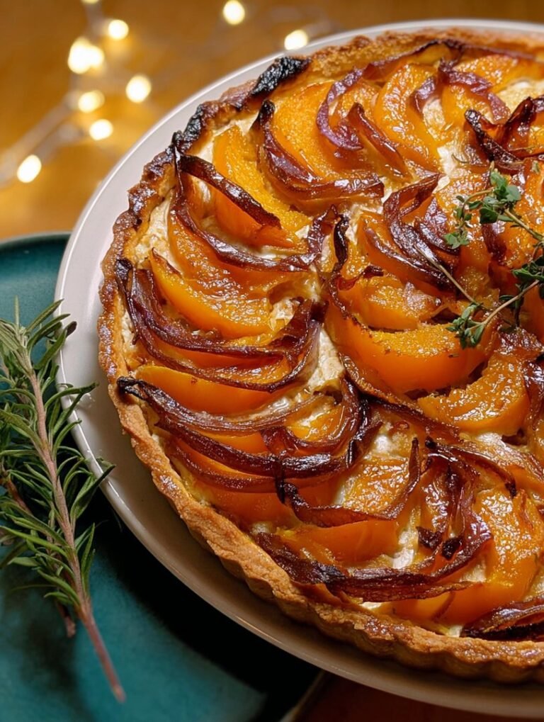 The stunning geometric arrangement of the vibrant orange squash and golden onions makes this tart a showstopper for any holiday table.