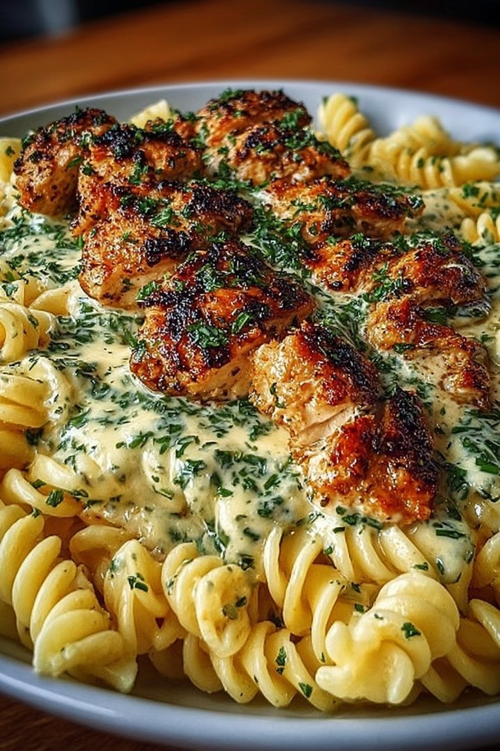 Cheesy Twisted Pasta with Creamy Garlic Parmesan Chicken