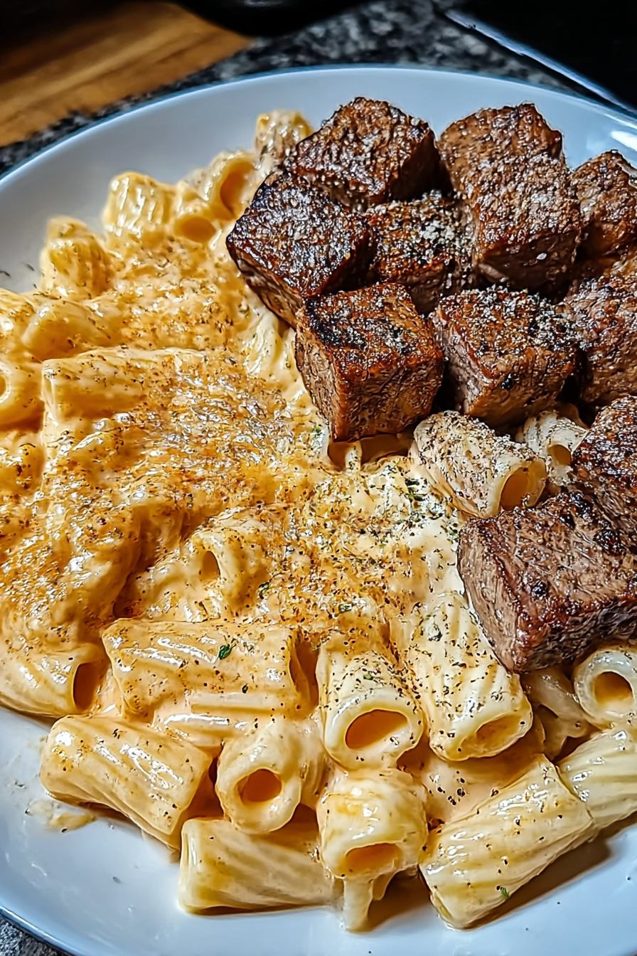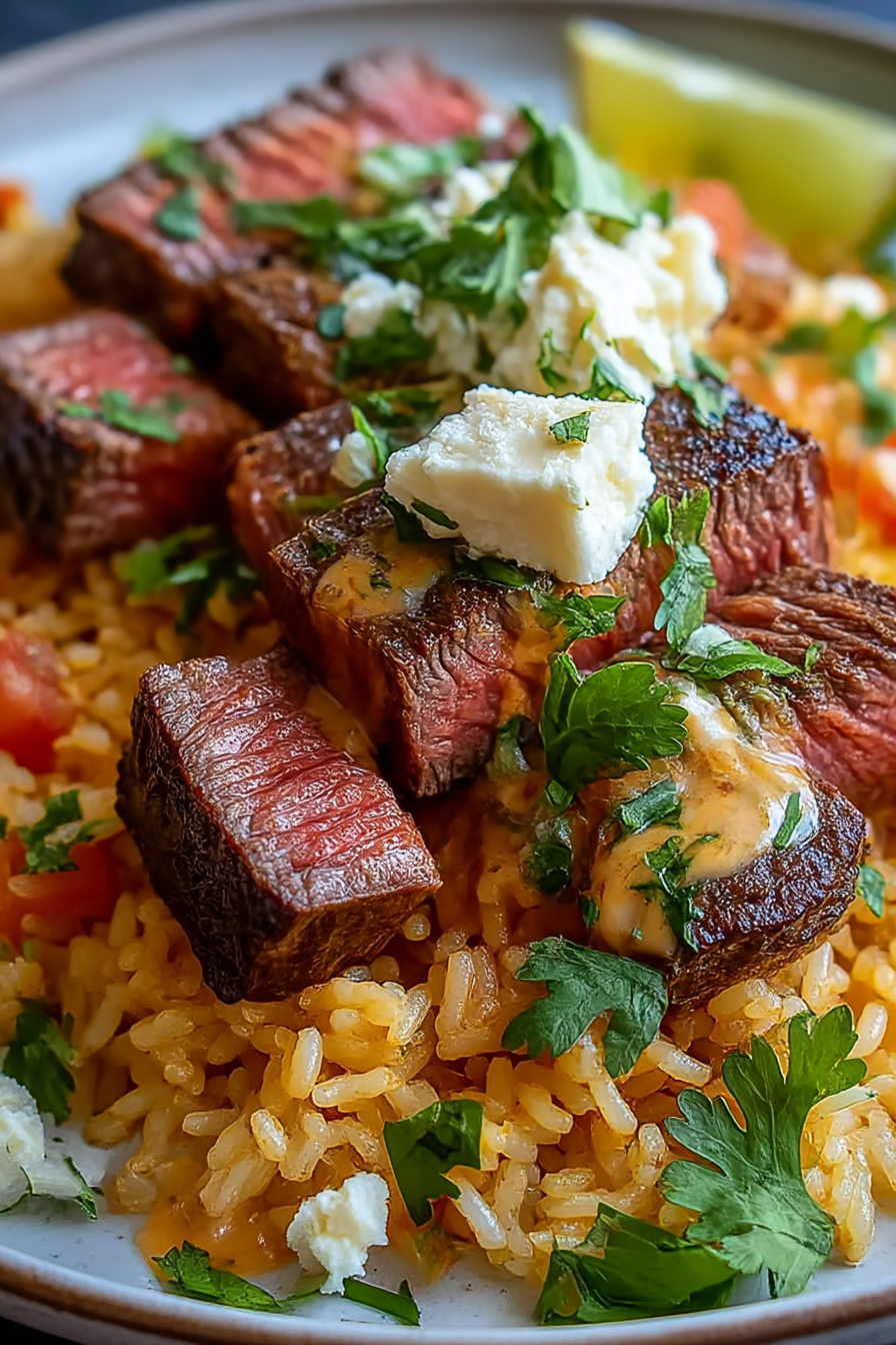 Garlic Butter Beef and Rice Skillet with Cheddar Parmesan Sauce
