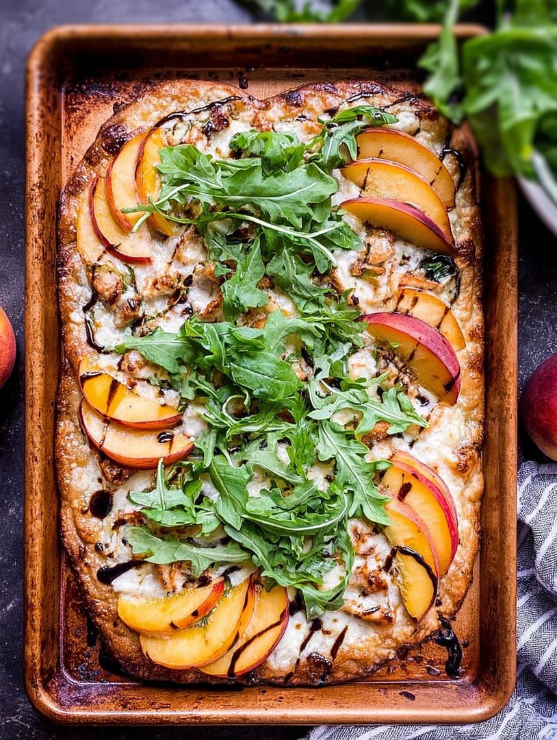 Peaches on pizza? Yes, absolutely. When you lightly grill or roast the peaches, their natural sugars caramelize, intensifying their sweetness and creating a smoky complexity. The warm, soft peaches contrast stunningly with the sharp, cool crunch of the arugula added after baking. Using ripe, firm peaches ensures they hold their shape during the high-heat cooking process.