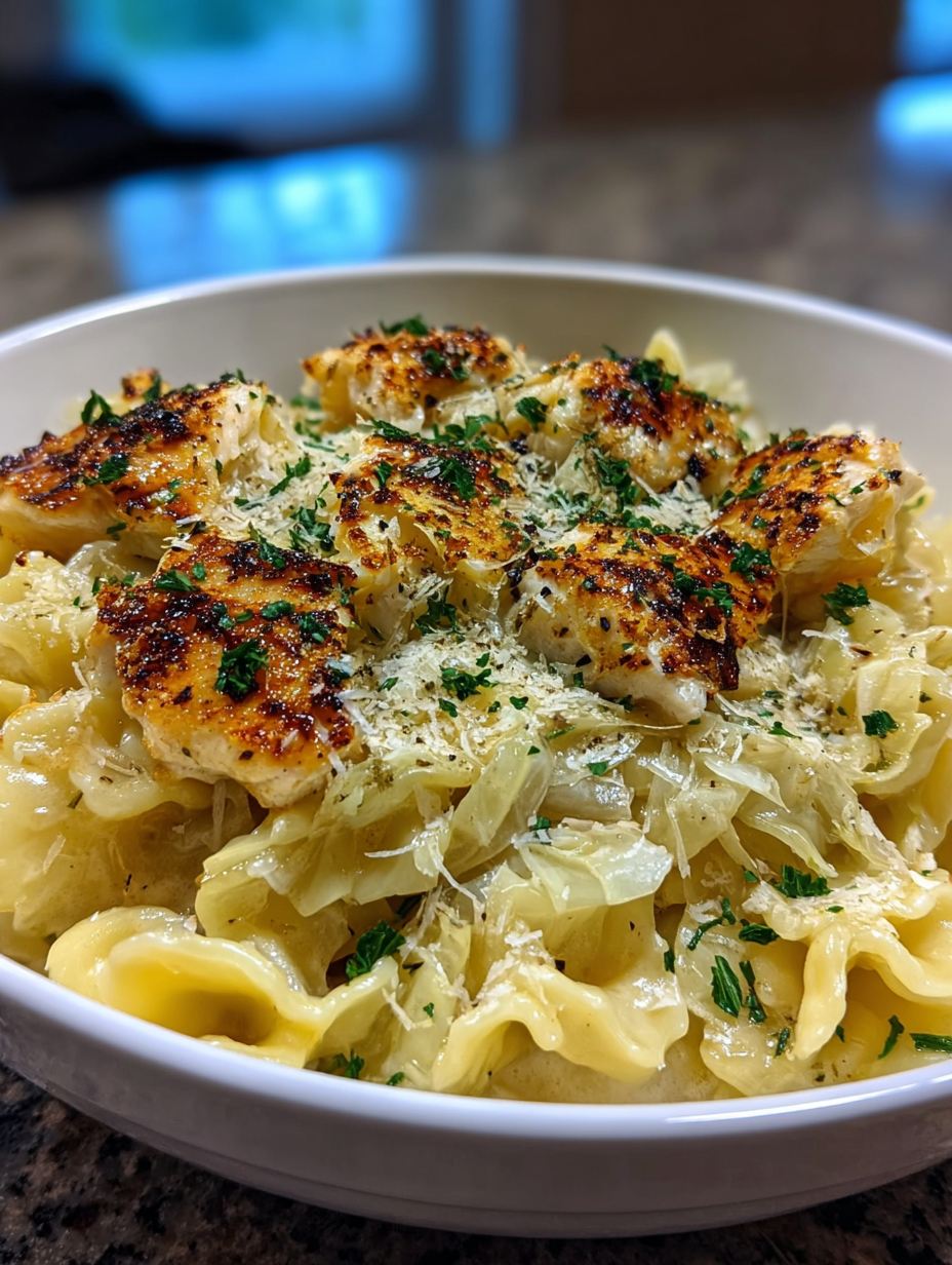 - Combine and Serve:Add the cooked, drained pasta, the sautéed cabbage, and the sliced chicken back into the skillet with the sauce. Toss gently to coat everything evenly in the beautiful creamy garlic alfredo. Serve immediately, topped with fresh parsley and extra grated Parmesan.