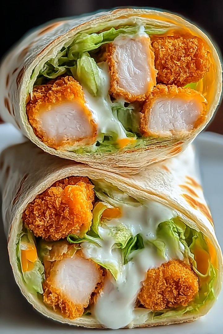 Warm the tortillas slightly in a dry skillet or microwave for a few seconds to make them more pliable. Lay a tortilla flat, then layer with shredded lettuce, crispy chicken pieces, shredded cheddar cheese, and a generous drizzle of ranch dressing.