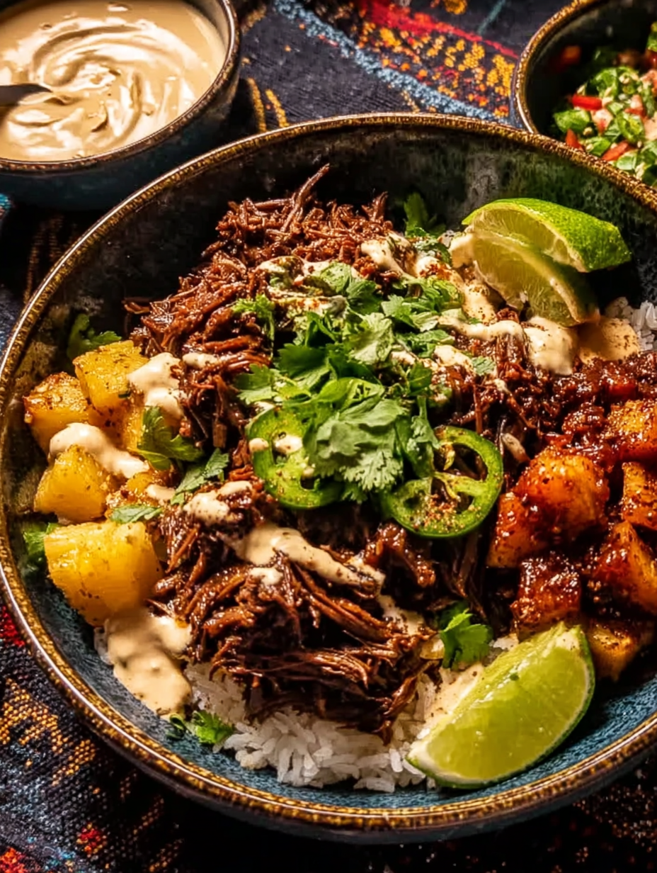 To serve this delightful creation, start with a comforting bed of fluffy white or brown rice. Top it generously with the shredded chipotle pineapple beef. Garnish with plenty of fresh cilantro, a critical squeeze of fresh lime juice (this addition is non-negotiable for cutting through the richness), and smooth avocado slices. The combination of the hot, smoky, sweet beef with the cool, crisp, and fresh toppings makes every bite a truly balanced adventure. It’s comforting yet exotic, heavy yet bright—a truly unforgettable experience.