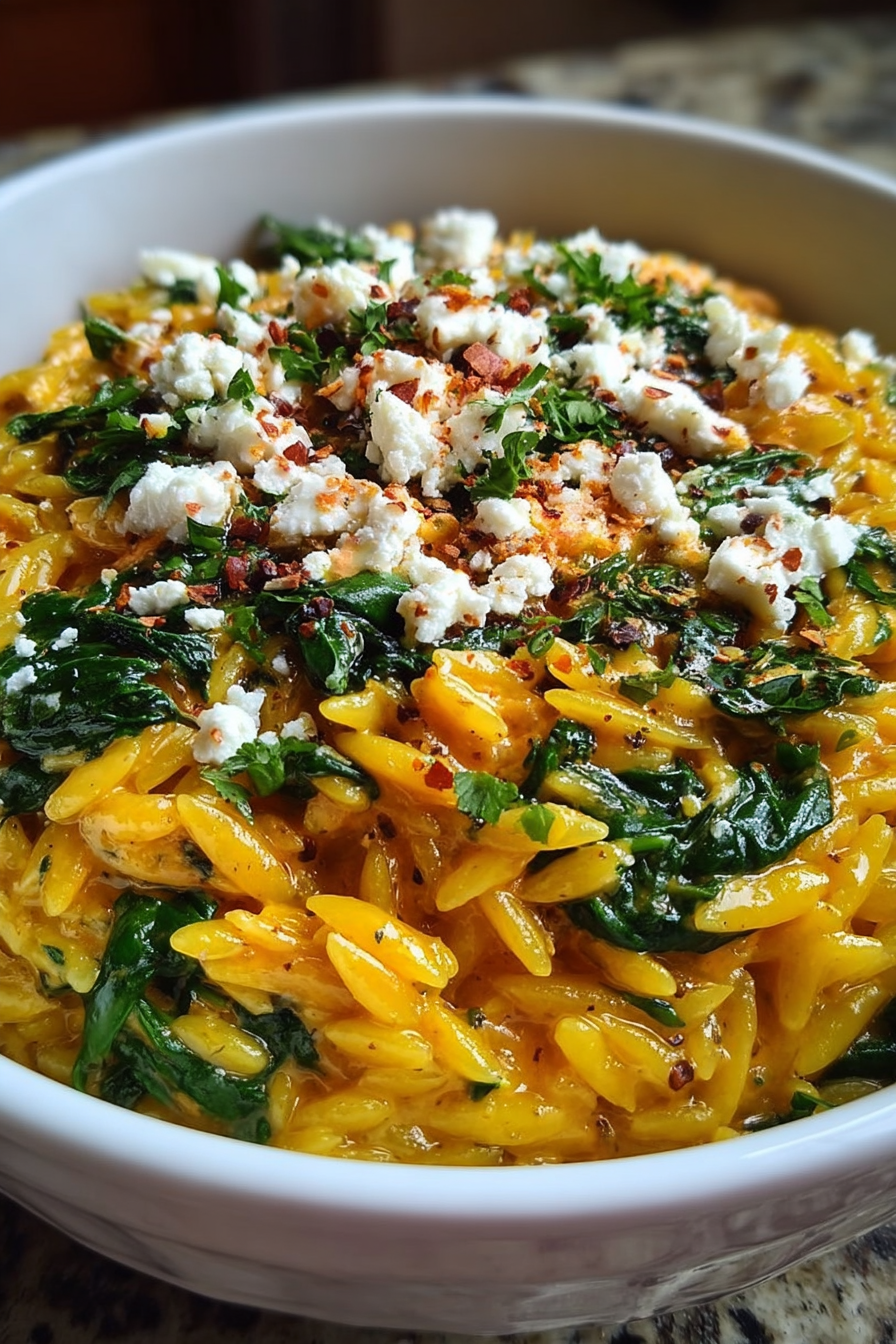 Imagine a bowl overflowing with sunshine-yellow orzo, each grain coated in a velvety pumpkin embrace, dotted with vibrant green spinach, and crowned with salty feta jewels. This **Deliciously Creamy Pumpkin Orzo with Spinach and Feta** isn’t just a meal; it’s a culinary hug!
