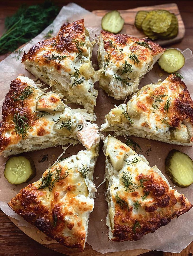 - The visual appeal is stunning, featuring golden crust dimples filled with fragrant dill, fresh herbs, and crunchy, caramelized pickle slices.