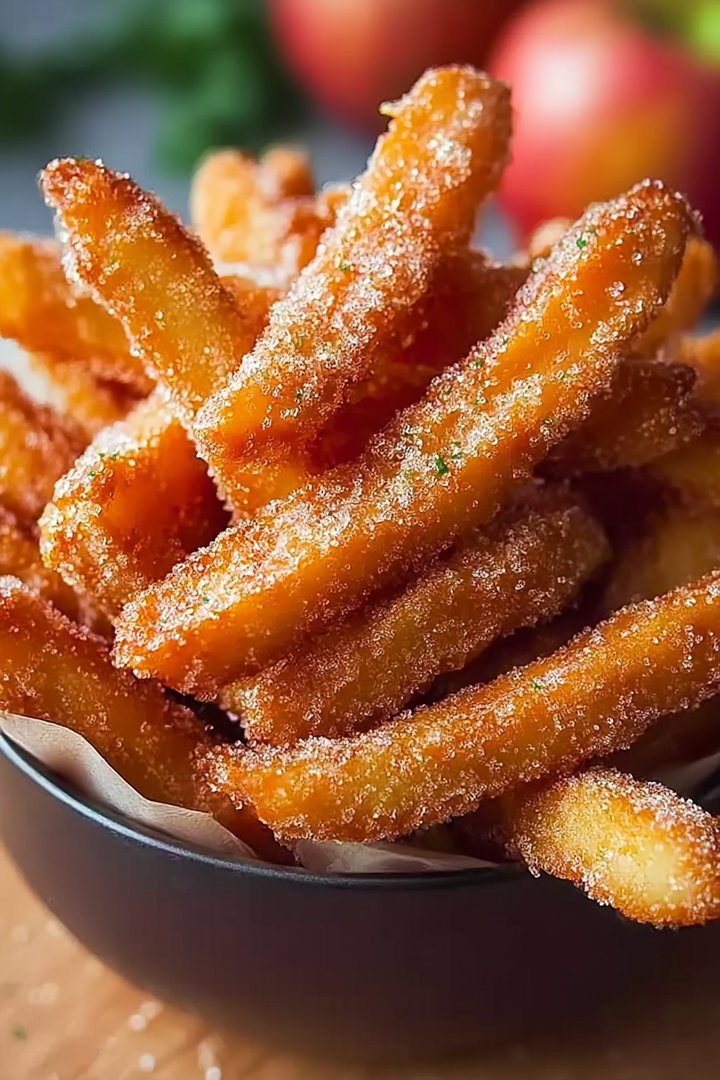 • These apple fries are surprisingly versatile and can be enjoyed on their own, dipped in yogurt, or as a topping for ice cream.