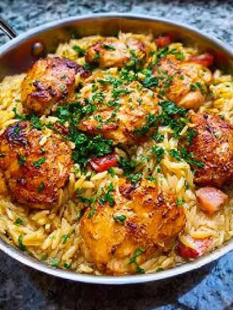 - Step 5: Slice the seared chicken thighs into strips or cubes. Return the chicken and any accumulated juices to the skillet, stirring them gently into the orzo. Cover and allow to heat through for 2 minutes before serving.
