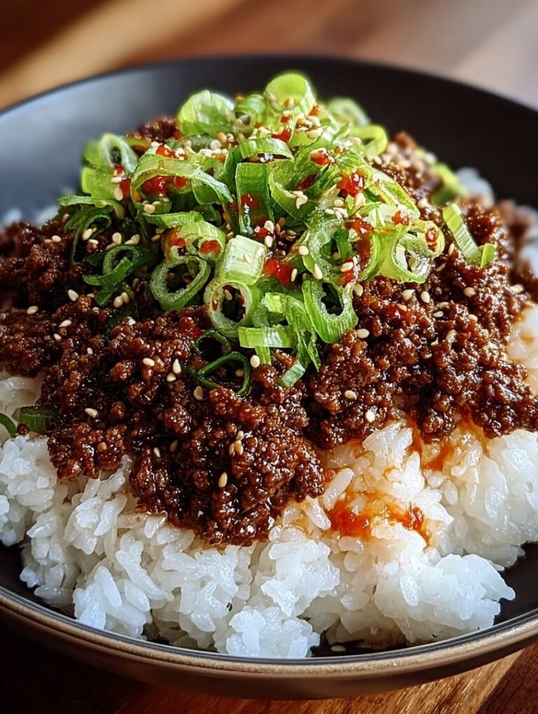 - Step 5: Spoon the hot honey ground beef generously over the top of the rice in each bowl. Garnish immediately with the sliced green onions before serving.