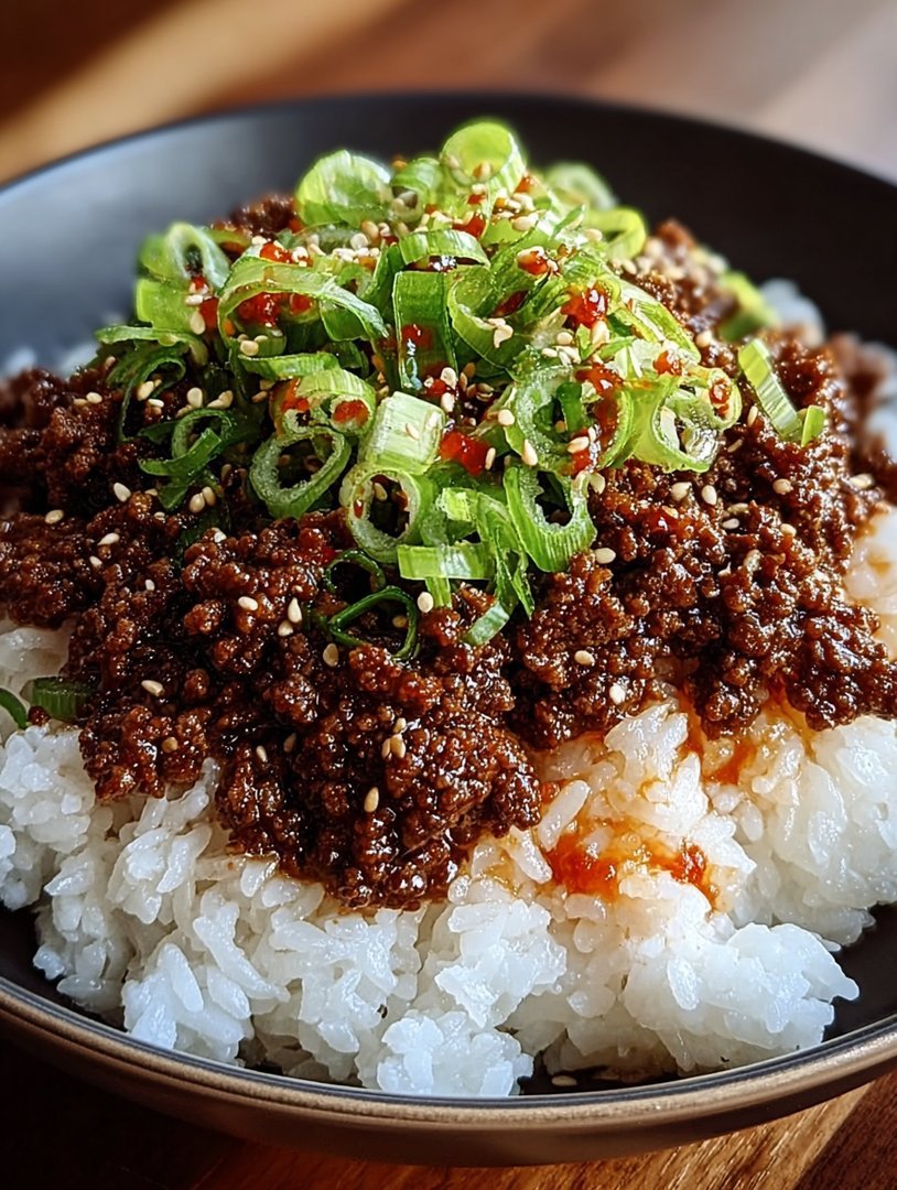 Ladle the freshly cooked rice into deep bowls. Spoon generous portions of the chili-glazed ground beef mixture over the rice. Garnish immediately with fresh cilantro, a sprinkle of green onions, and a squeeze of fresh lime juice. The acid from the lime cuts through the richness and balances the sweet heat perfectly, making every bite utterly irresistible.