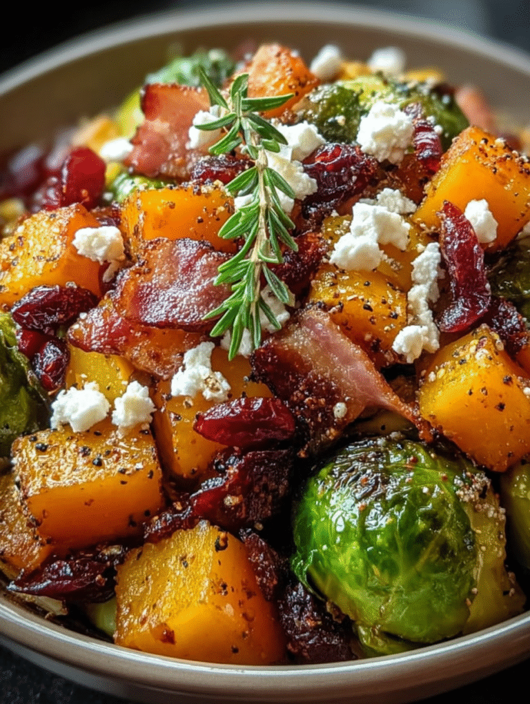 Honey-Glazed Brussels Sprouts and Butternut Squash with turkey turkey bacon de dinde, Cranberries, and Feta