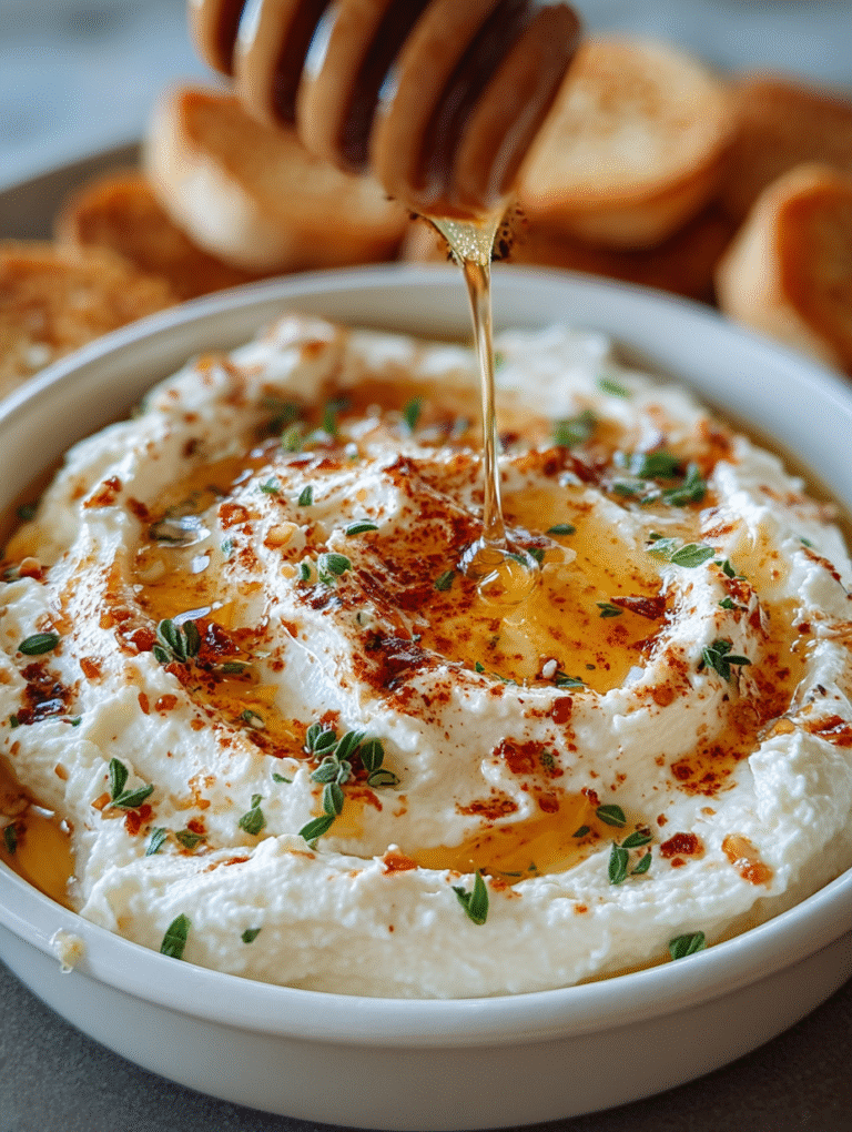- Step 4: Sprinkle the dip lightly with flaky sea salt and the reserved 1 tablespoon of hot honey (optional, for extra heat and shine).