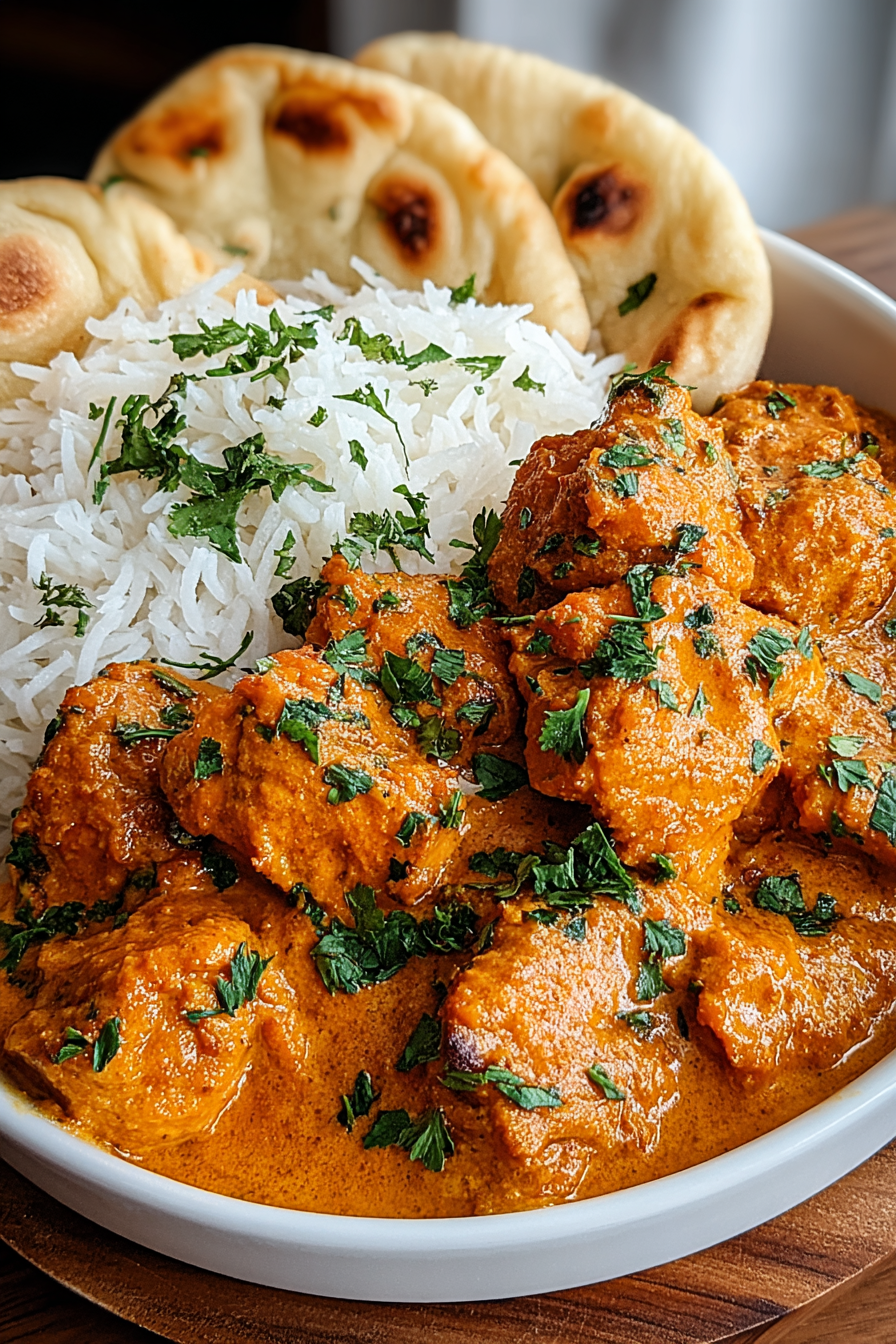 Garnish with fresh cilantro leaves and a drizzle of cream (optional). Serve hot with basmati rice, naan bread, or roti. This Indian Butter Chicken recipe is delicious served with a side of raita (yogurt dip) and some sliced cucumbers and tomatoes for a complete and satisfying meal.