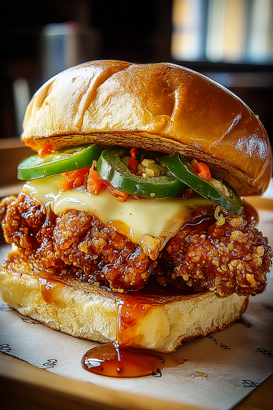- Step 5: Assemble the Sandwich. Lightly toast the brioche buns. Place a piece of the freshly drenched chicken onto the bottom bun. Drizzle any remaining Jalapeño Honey from the saucepot over the top, and cap with the upper bun. Serve immediately while the crust is still crispy and warm.