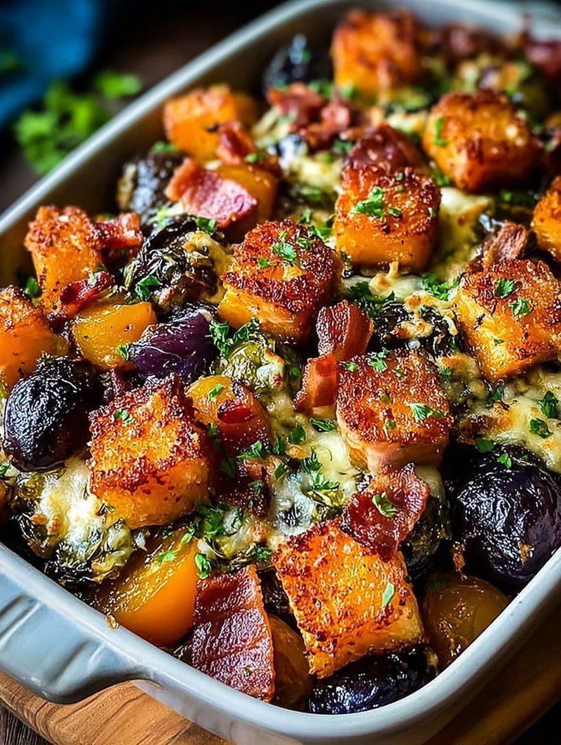 This dish is the culinary equivalent of putting on your favorite cozy sweater. It’s warm, deeply satisfying, and manages to turn two notoriously tricky vegetables—Brussels sprouts and butternut squash—into irresistible stars. We are elevating simple roasting into an art form using high-heat caramelization combined with the irresistible sweetness of maple syrup. The inclusion of turkey and thinly sliced, smoky turkey beef bacon de dinde ensures that this isn’t just a side dish, but a fully balanced, glorious main course. Forget the usual boring weeknight routine; this is flavor magic.