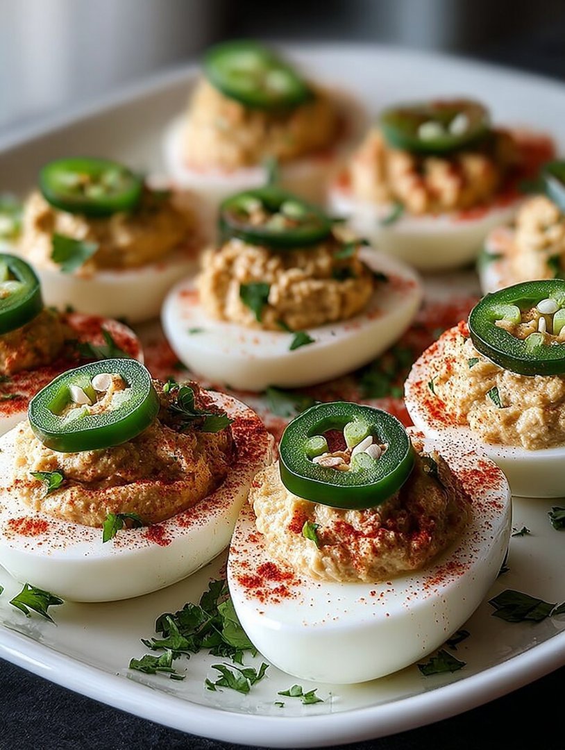 These spicy stuffed eggs pair beautifully with almost any casual event. Serve them alongside grilled chicken skewers or beef barbacoa tacos for a balanced spread. For drinks, skip the heavy sodas and opt for something bright and effervescent, like sparkling water infused with mint and cucumber. They also make a fantastic addition to brunch when served alongside a savory breakfast burrito bowl. Always ensure the deviled eggs remain chilled until the last possible moment, especially if serving outdoors.