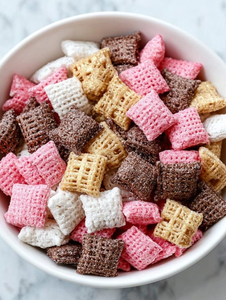 Once cooled, combine all three batches—chocolate, vanilla, and strawberry—in your largest serving bowl. Give them one last, gentle stir to fully mix the colors and flavors. The resulting look is stunning: a patchwork of creamy white, deep brown, and cheerful pink, all dusted with a fine layer of white sugar. It truly is the prettiest snack mix you will ever create.