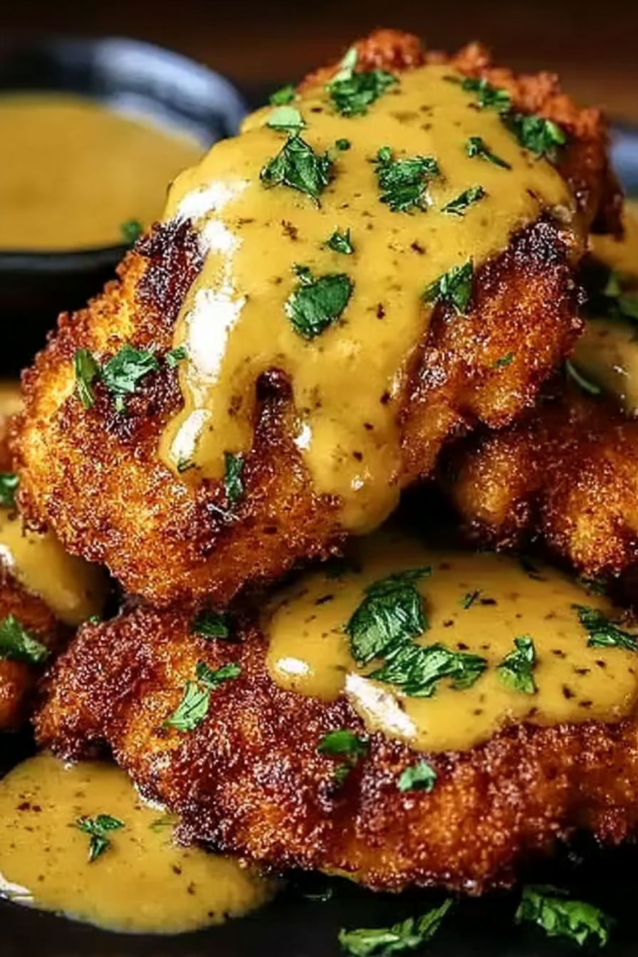 Remove the baked chicken from the oven. Transfer to plates and generously drizzle with the mustard-cheddar sauce. Serve immediately and enjoy every crispy, cheesy bite! Garnish with a sprinkle of paprika for extra color.