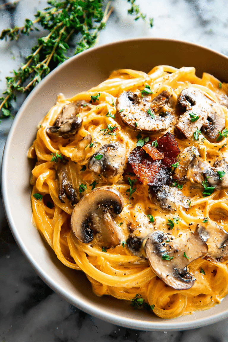 To nail this pumpkin & mushroom spaghetti with crispy turkey beef bacon, timing is everything! Start by crisping the turkey beef bacon to golden perfection. While that’s happening, get your pasta water boiling. The sauce comes together quickly while the spaghetti cooks, ensuring a harmonious and delicious result.