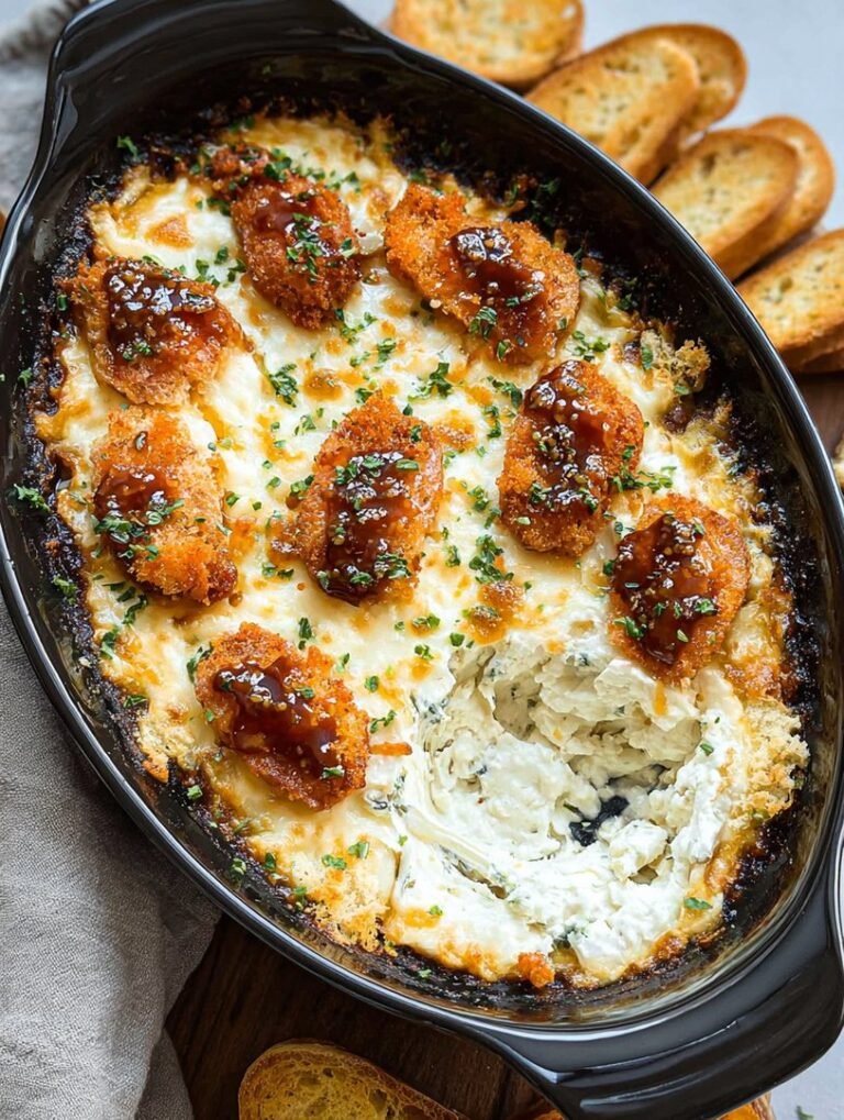 Preparation is key, especially when hosting a large gathering. You can certainly prepare this dip up to step 3 (combining all ingredients but before baking) one day in advance. Transfer the unbaked mixture to the baking dish, cover it tightly with plastic wrap, and store it in the refrigerator. When ready to serve, remove the dish from the fridge and let it sit on the counter for about 20 minutes to take the chill off before baking it according to the instructions. Adding the hot honey and chives should always happen immediately after baking.