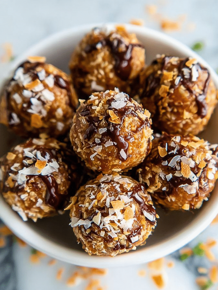 Place the rolled Samoa Energy Balls in the refrigerator for at least 30 minutes to firm up. While they chill, melt the dark chocolate chips gently over a double boiler or in the microwave in 30-second intervals, stirring until smooth. Drizzle the melted chocolate artistically over the chilled balls, then return them to the fridge until the chocolate sets, usually about 10 minutes.