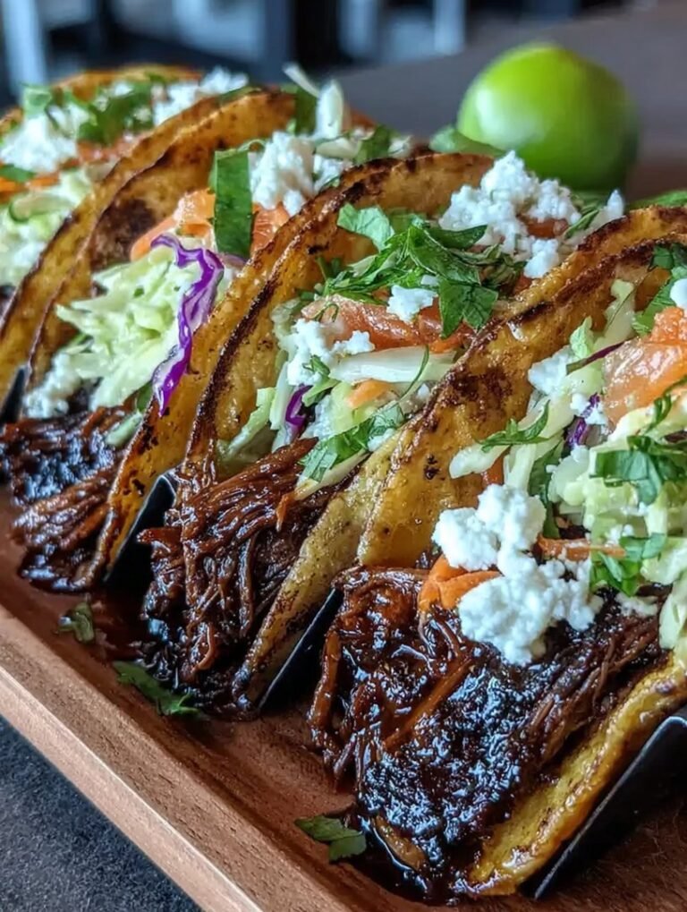 Enjoy your flavorful journey with these Slow-Cooked Korean Beef Tacos topped with tantalizing slaw! The combination of rich beef and vibrant crunch will surely make this dish a favorite at your table.