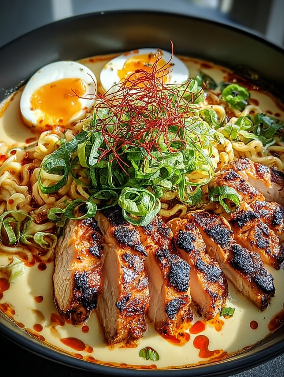 The moment of truth has arrived. Ladle the creamy garlic broth into large serving bowls. Place a generous mound of the cooked ramen noodles into the center of the broth. Arrange the fiery chicken pieces artfully over the noodles. Garnish generously with the sliced scallions, fresh cilantro, and a vibrant soft-boiled egg half.