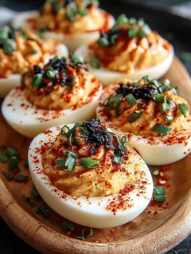 - Step 5: Garnish the deviled eggs with finely chopped green onions and toasted sesame seeds.