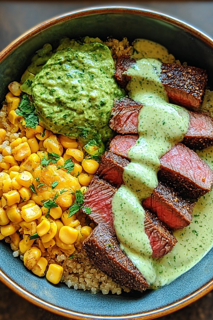 How to Make Steak Avocado Roasted Corn Bowl with Cilantro Cream Sauce delights!