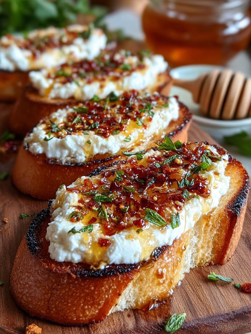 Start by slicing and baking the baguette immediately to crisp the crostini base. While the bread cools, whip the feta until ultra-smooth. Only apply the hot honey and toppings right before serving, ensuring the contrast of warm spice and cool cheese remains vibrant, delivering the essential flavor contrast that makes these so memorable.