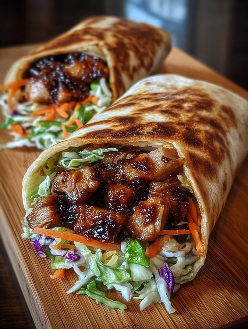 Fold the sides of the tortilla inward over the filling, then roll tightly from the bottom upward, securing the delicious contents inside. Slice the wrap in half diagonally for an excellent presentation. Transfer to plates and drizzle with extra sauce or serve with a side of Asian-inspired slaw for the perfect finishing touch.