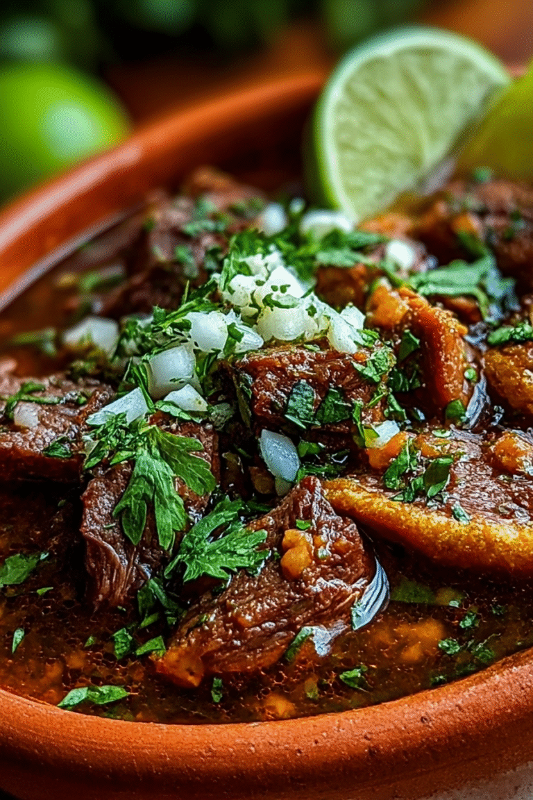 Serve the traditional Mexican birria hot, garnished with chopped onion, cilantro, avocado slices, and lime wedges. Enjoy it as a hearty stew or use it to make delicious birria tacos by dipping tortillas in the broth and then filling them with the shredded beef and your favorite toppings.