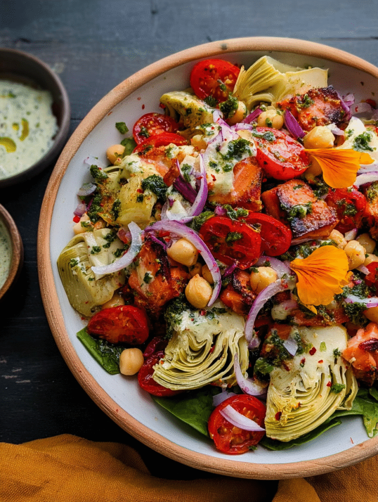 Salads often get a bad rap for being flimsy or unsatisfying, but this recipe is designed to be substantial. The key is using ingredients that are already packed with umami and depth. We aren’t relying on plain lettuce to carry the weight; we’re using meaty artichoke hearts and roasted vegetables. Think of this process less as “making a salad” and more as “assembling a perfectly curated antipasto platter” into one glorious bowl. The flavors need time to marry, which is why this dish actually tastes better if you make it an hour or two ahead of time. I learned this trick when rushing to prepare food for a summer block party. I tossed the salad together quickly, threw it in the fridge, and forgot about it until serving time. The result? The tangy dressing had soaked into every crevice, transforming a collection of ingredients into one cohesive, glorious whole.