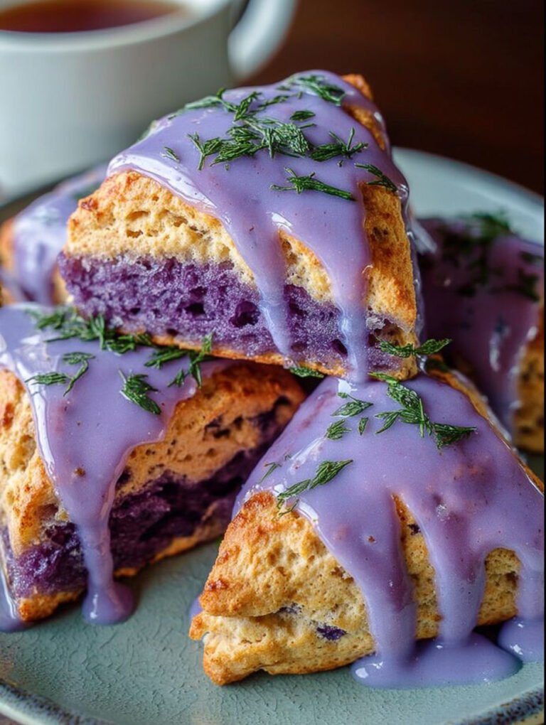 The ube, also known as purple yam, adds a whimsical touch and stunning color to these scones. As you cut into them, you’ll find a fluffy interior that’s almost too pretty to eat—almost! The sweet, nutty taste of ube pairs perfectly with the creaminess of the glaze, creating a harmonious blend that’s sure to make your taste buds dance.
