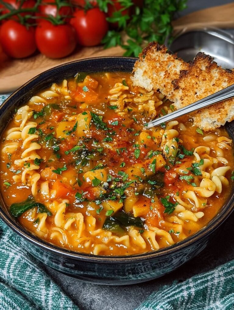 Dive into this cozy soup! We build a rich soffritto base, simmered 20 minutes with crushed San Marzano tomatoes, creating intense Italian flavor. Ruffled noodles capture every drop.