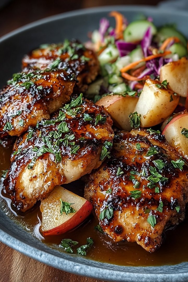 6. **Serve and Enjoy: ** Serve the sticky apple cider chicken over a bed of crisp autumn slaw. Garnish with chopped parsley or thyme, if desired.